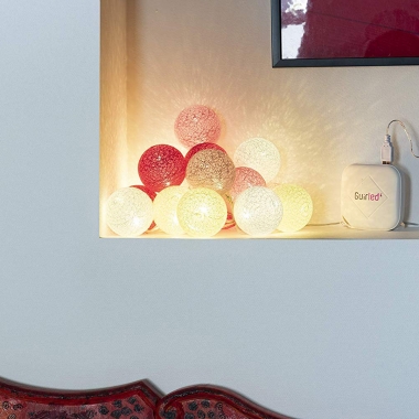 - Lichterkette mit 16, 24 oder 32 LEDs - 16, 24 oder 32 Kugeln aus geflochtener Baumwolle - Doppel-USB-Adapter 2A Max - Auf der Schachtel aufgedruckte Gebrauchsanweisung - Recycelter Karton