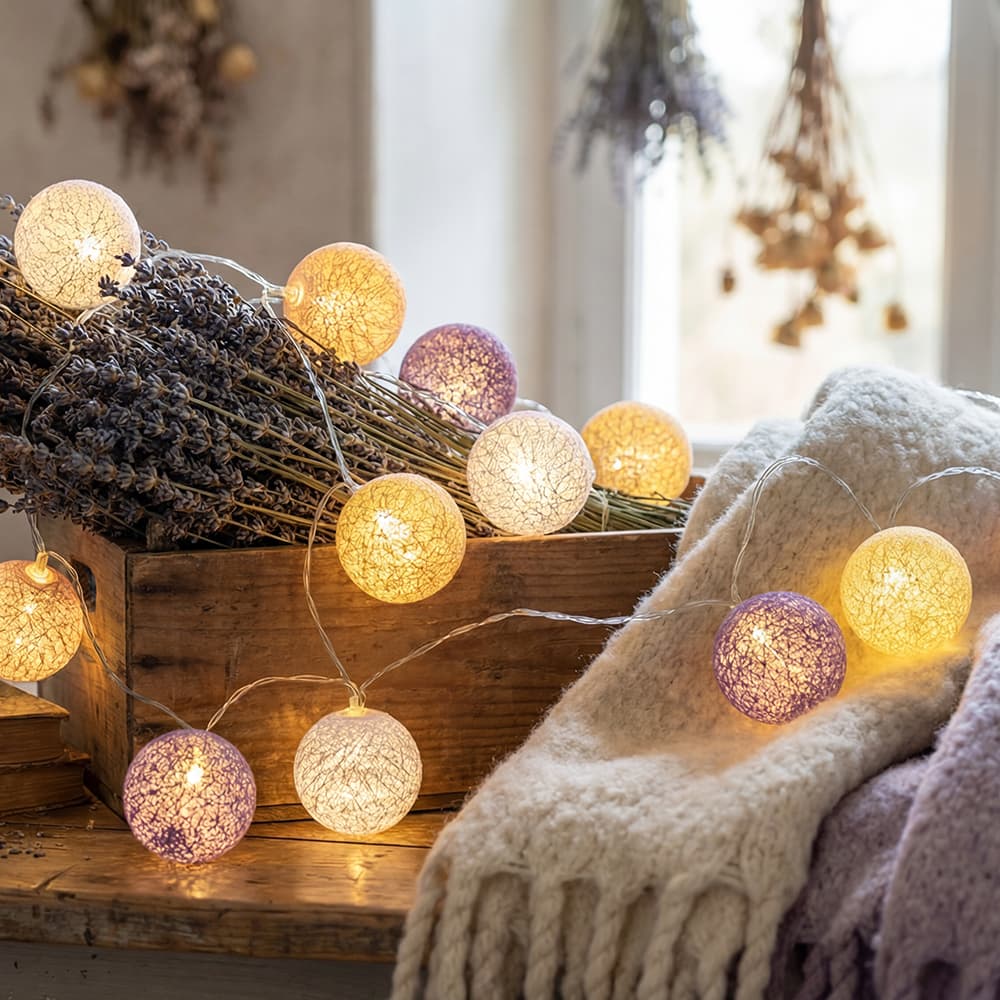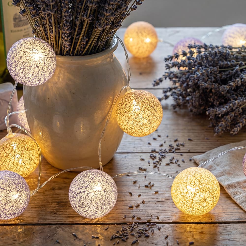 Discover all the color choices we offer: indoor light garland. This Provence light garland is a beautiful addition to your indoor decor. The composition of soft colors makes it a decorative accessory that is as charming as it is romantic. The cotton balls give it a rustic yet subtle look that will brighten up your home. The Provence garland is a must-have for everyone who dreams of an elegant decor. Take the time to explore the entire collection of cotton garlands.
