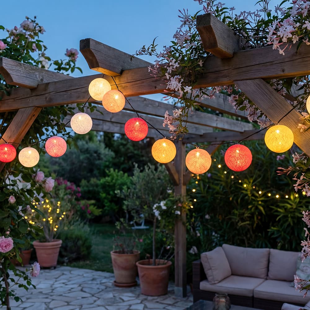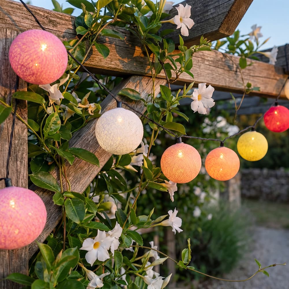 A solar garland synonymous with colorful ambiance creation, here is the Tagada model. During the day, its cotton balls in pink tones bring some pep to your outdoor space. At night, after having charged all day thanks to the solar panel, when it lights up, the effect is magnificent. Take a moment to discover all our colors: Ball garland