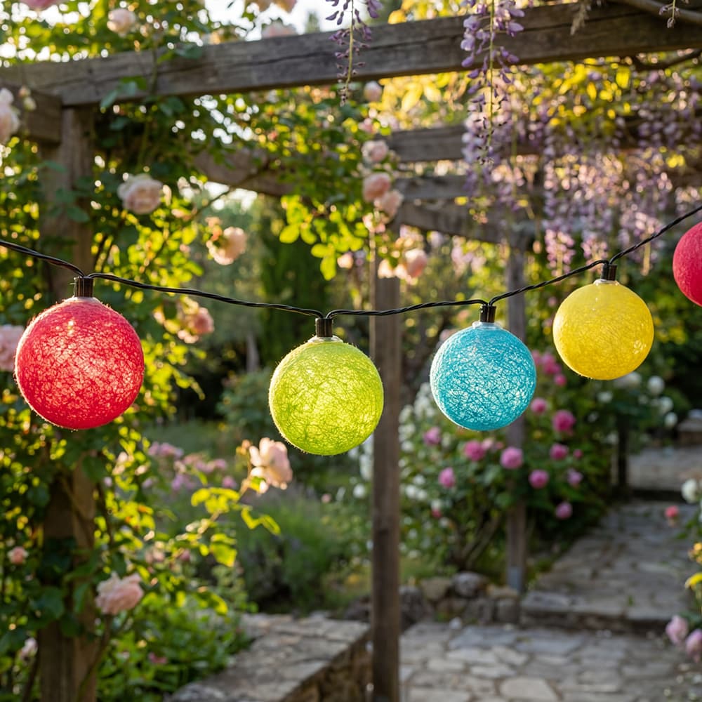 ⚠️ If you wish to take in your garland in winter, it is best to do so at the end of the day, when the solar panel has had the opportunity to charge fully. Once this removal is done, don't forget to press the OFF button (garland off) to avoid any risk of battery discharge. The degradation of the balls during the lifespan of the garland is not covered by the warranty. We advise you to secure it with as many attachment points as possible (at least 4 for 16 balls and 8 for 32). Do not attach the garland to a moving branch, as it may break with the wind. Do not hang the garland only by the two ends, as it may sag under its own weight or due to wind/rain.