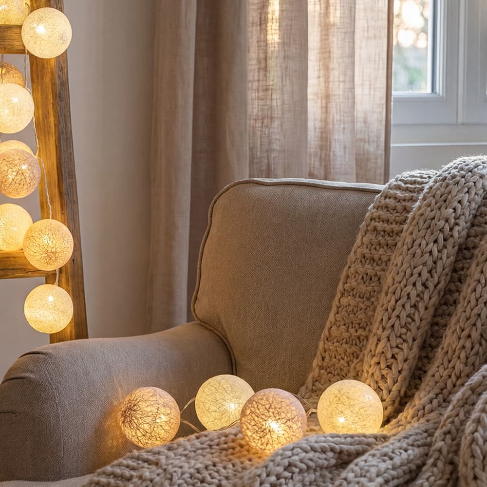 | Contents of the box | Light garland with 16, 24, or 32 LEDs - 16, 24, or 32 twisted cotton balls - Dual USB adapter 2A Max - Printed instructions on the box - Recycled cardboard. |